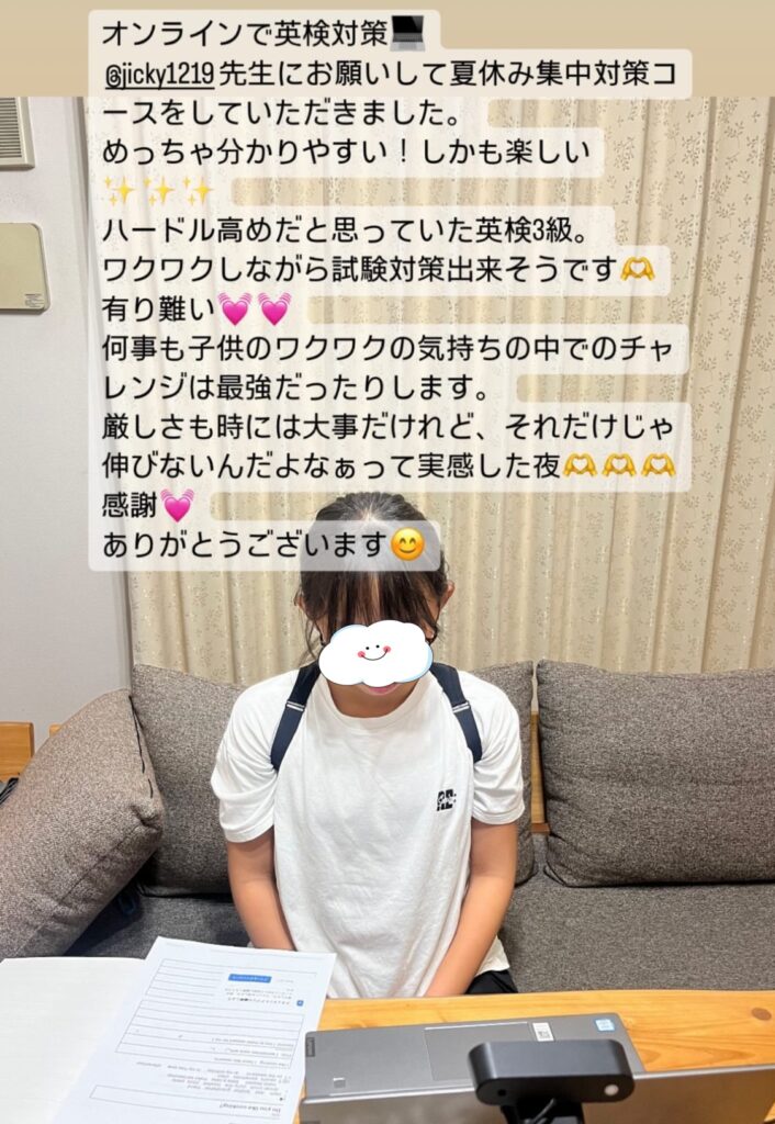 英検®3級のライティング講座を夏休み特別企画を開催。その時に参加してくださいました、お母さまからうれしいお声をいただきました。 ありがとうございます。子供に英語は楽しいものを思ってもらえるよう、英語好き!と思ってもらえるように考えながらレッ... -