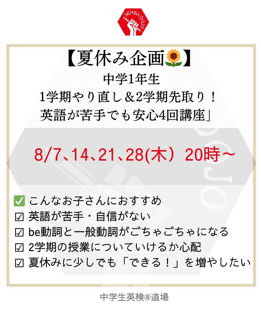 - 対象: 中学1年生(英語が苦手・不安な方向け)